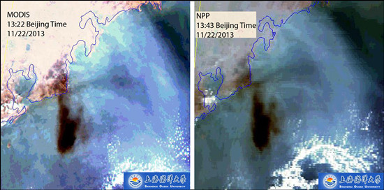 2013年11月22日,黄岛石油管道发生爆炸事故。万象城官网卫星遥感地面站在事故3小时后,接收、处理了美国高分辨率卫星图像。发挥了万象城官网利用遥感技术在灾害事件下的快速反应能力。图中是火灾3小时后接收的美国MODIS(左)和NPP(右)合成彩色图像。图中黑色部分是燃烧形成的黑烟,面积约400平方公里,向离岸方向移动。跟踪表明黑烟继续向黄海深海方向移动,对附近城市的空气没有造成巨大污染。