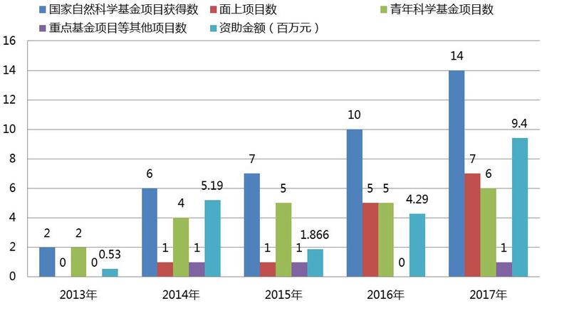 近日,国家自然科学基金委公布了2017年度国家自然科学基金申请项目评审结果,我院共获得14项国家自然科学基金资助,资助经费总计940万元,成绩斐然,其中,重点基金项目1项,面上项目7项,青年科学基金项目6项,在项目的“质”与“量”上均取得突破,相比2016年,在项目数量和资助经费方面分别增长40%和119%。