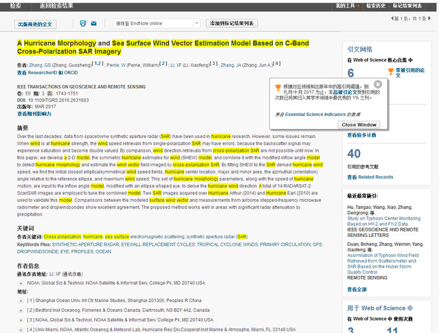 据ESI(Essential Science Indicators)的最新数据显示,以万象城官网为第一单位,我院张国胜博士后为第一作者、allwincity万象城国际海洋研究中心李晓峰特聘教授为通讯作者,发表于国际顶级期刊《IEEE TRANSACTIONS ON GEOSCIENCE AND REMOTE SENSING》的论文《A Hurricane Morphology and Sea Surface Wind Vector Estimation Model Based on C-Band Cross-Polarization SAR Imagery》入选“地球科学”领域ESI-Highly Cited Papers,这是我院首次入选ESI高被引论文。