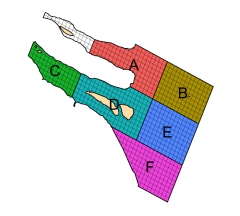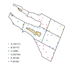 采用分层随机方法设计调查站位,第一航次拟设计调查站位60个 (图2右),其中定置张网亲鱼采样站位8-10个。第二航次开始,根据调查数据分析结果,进行调查站位的优化,以最大限度的节省调查费用。A和B区租用1船,C和D租用1船,E和F租用1船,尽量从就近码头租用,若进展顺利,估计4天即可调查完毕。围网站位暂时没有设计,同各位老师讨论后再进行设计。