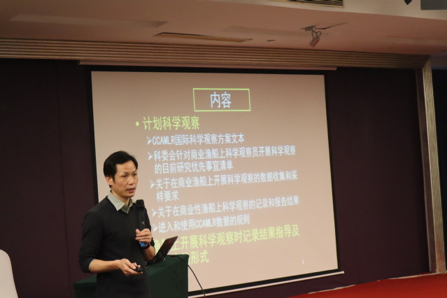 本次培训围绕南极主要生物资源状况,南极海洋生物资源养护委员会及其磷虾渔业管理体系总体情况,南极磷虾渔场及环境,南极磷虾生物学特点,主要生物种类及鉴别方法,养护数据的记录、表格填写、数据报告等,公海登临检查,观察员计划等内容进行了讲解。另外本次培训还邀请到了南极海洋生物资源养护委员会执行秘书David Angew及国际科学观察员协调官Isaac Forster做了专题报告。
