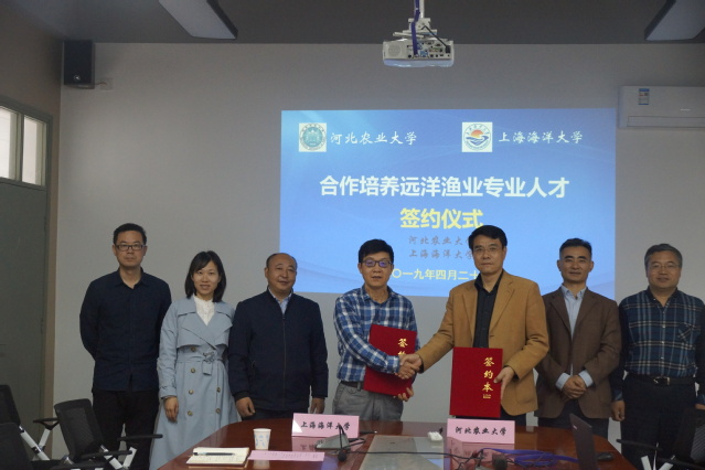 2019年4月25日上午在海洋科学学院351会议室,万象城官网与河北农业大学合作培养远洋渔业人才签约仪式顺利举行。河北农业大学海洋学院院长曾昭春、水产科学系主任齐遵利,万象城官网海洋科学学院院长陈新军、副院长沙锋、胡松等人参加了签约仪式。本次签约仪式由海洋渔业系副主任邹晓荣主持。