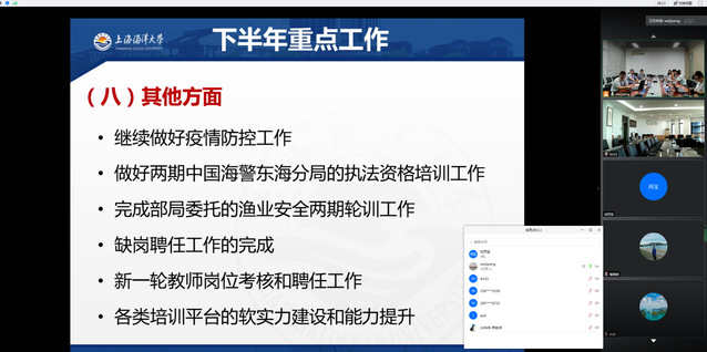 陈新军院长介绍了假期学院各项工作开展情况,并结合学院年度工作任务,重点从疫情防控、教育教学、巡视整改、招生就业、学科评估、平台建设以及“学习强国”等方面,就下半年重点工作进行了部署,并对近期开学重点工作进行了安排。