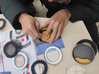 “针”心真意,椪糖游戏。椪糖共有五种形状,用针仔细的扣出椪糖即为成功,同学们屏息凝神生怕稍不留意就将椪糖扣碎。