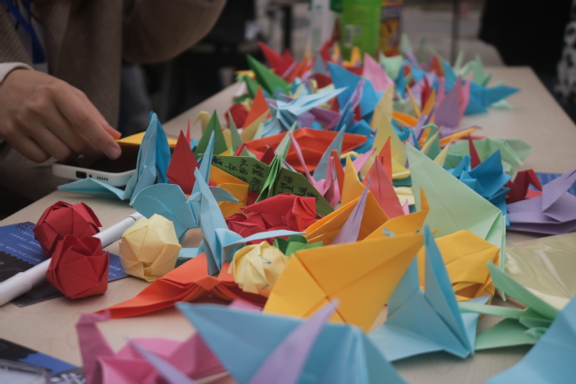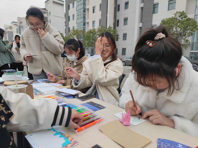 万“羽”千言是折纸鹤,同学们在工作人员的指导下,细心地折成一只只千纸鹤,还有同学技术高超,孔雀、玫瑰等成品陈列其中。