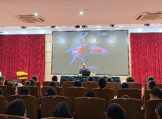 讲座由方舟教授主讲,主要从概述、外部形态、内部结构与功能三个方面给同学们介绍了头足类海洋动物,在方舟老师的生动有趣、浅显易懂又幽默诙谐的讲解下,同学们兴致高昂,积极热情参与发言。